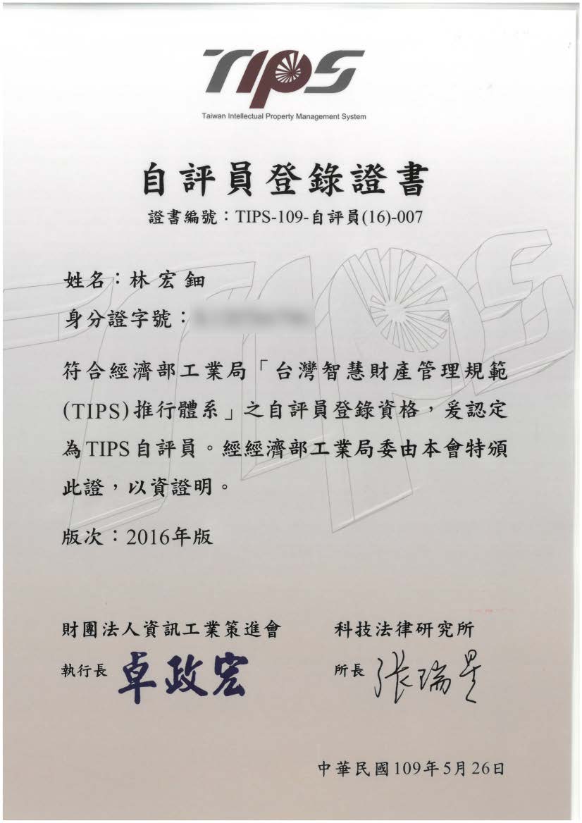 恭賀!本所林宏鈿 先生取得TIPS自評員資格!