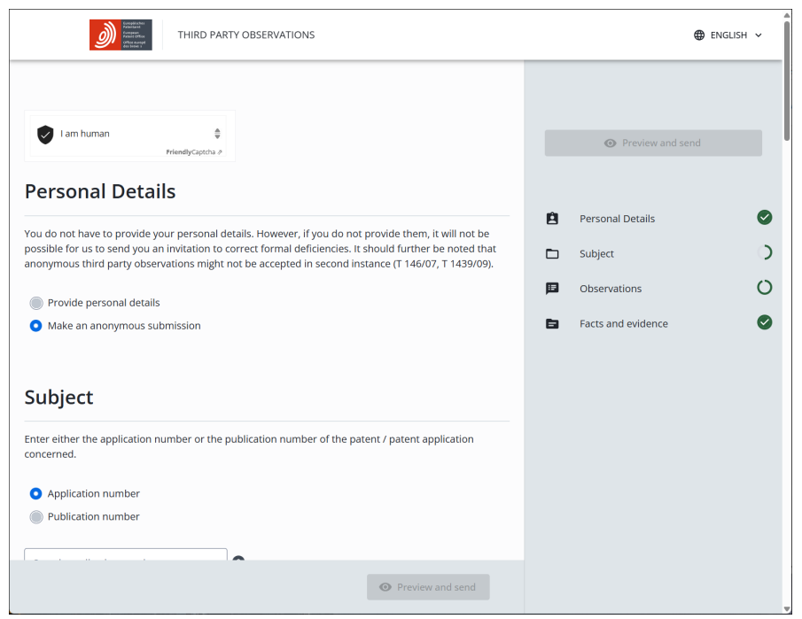 為了方便任何人可提出「第三方意見」,EPO於2025年12月16日在其官網上提供了線上提交「第三方意見」表單,申請人可以匿名或具名的方式提交,使用語言必須是英語、法語或德語。